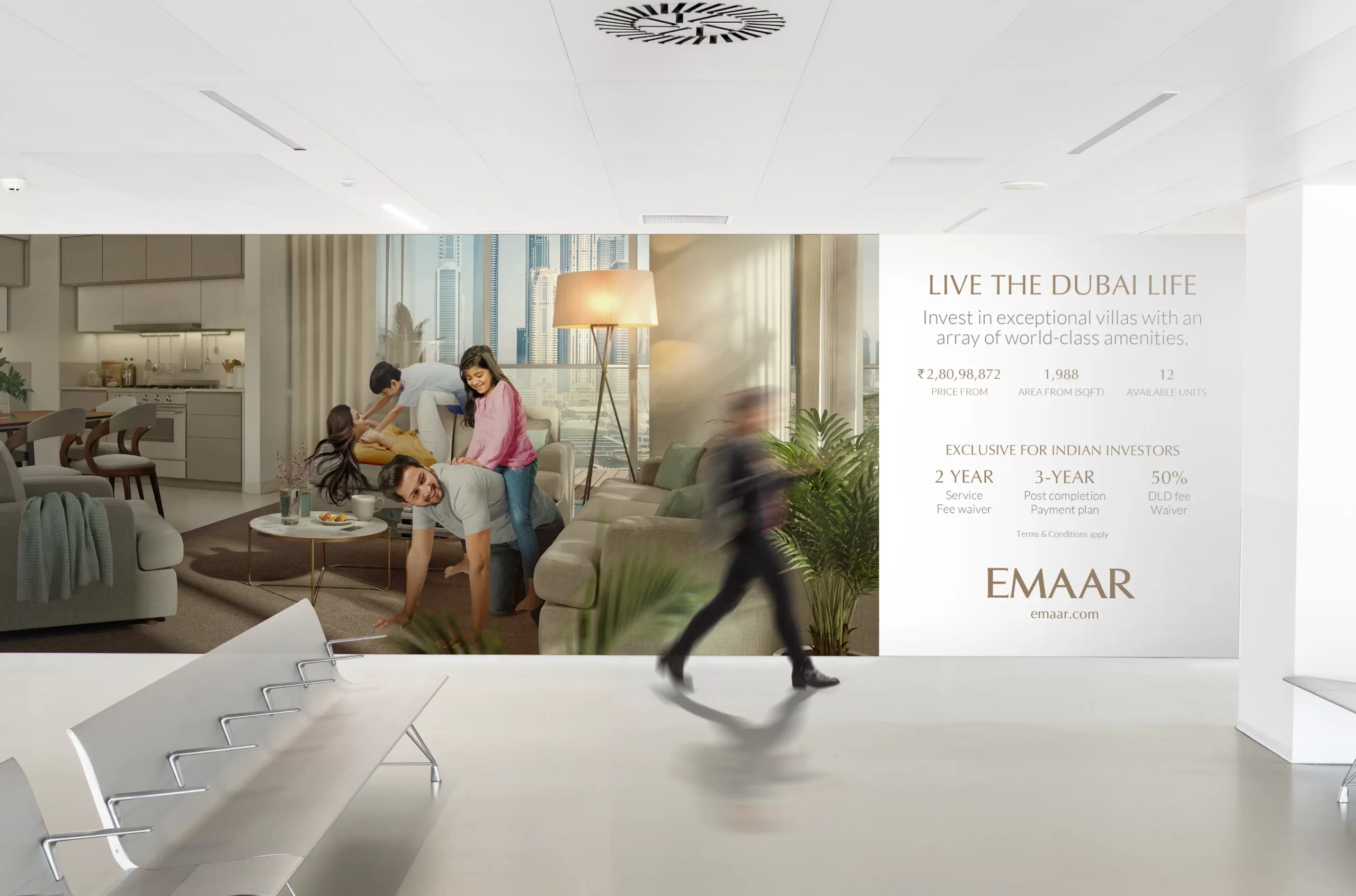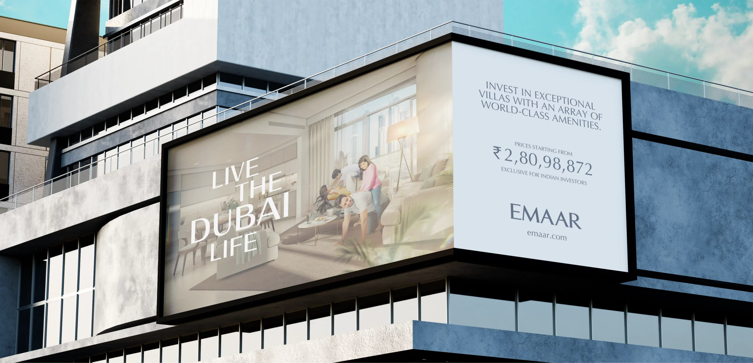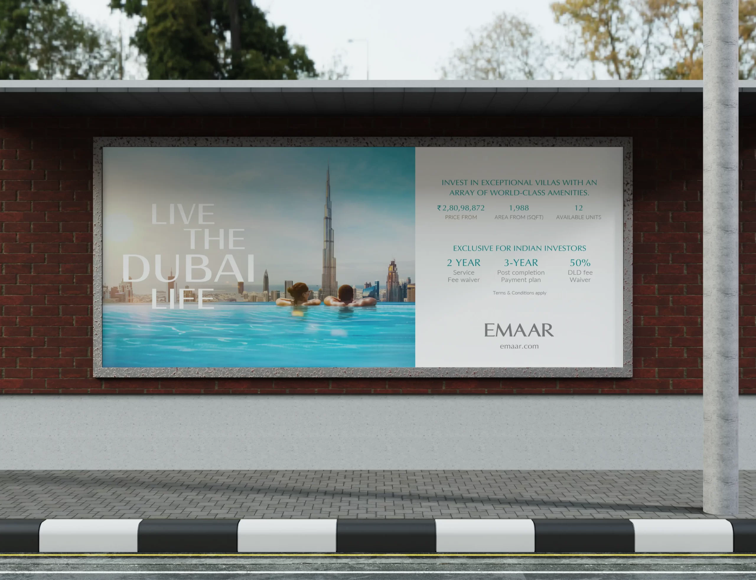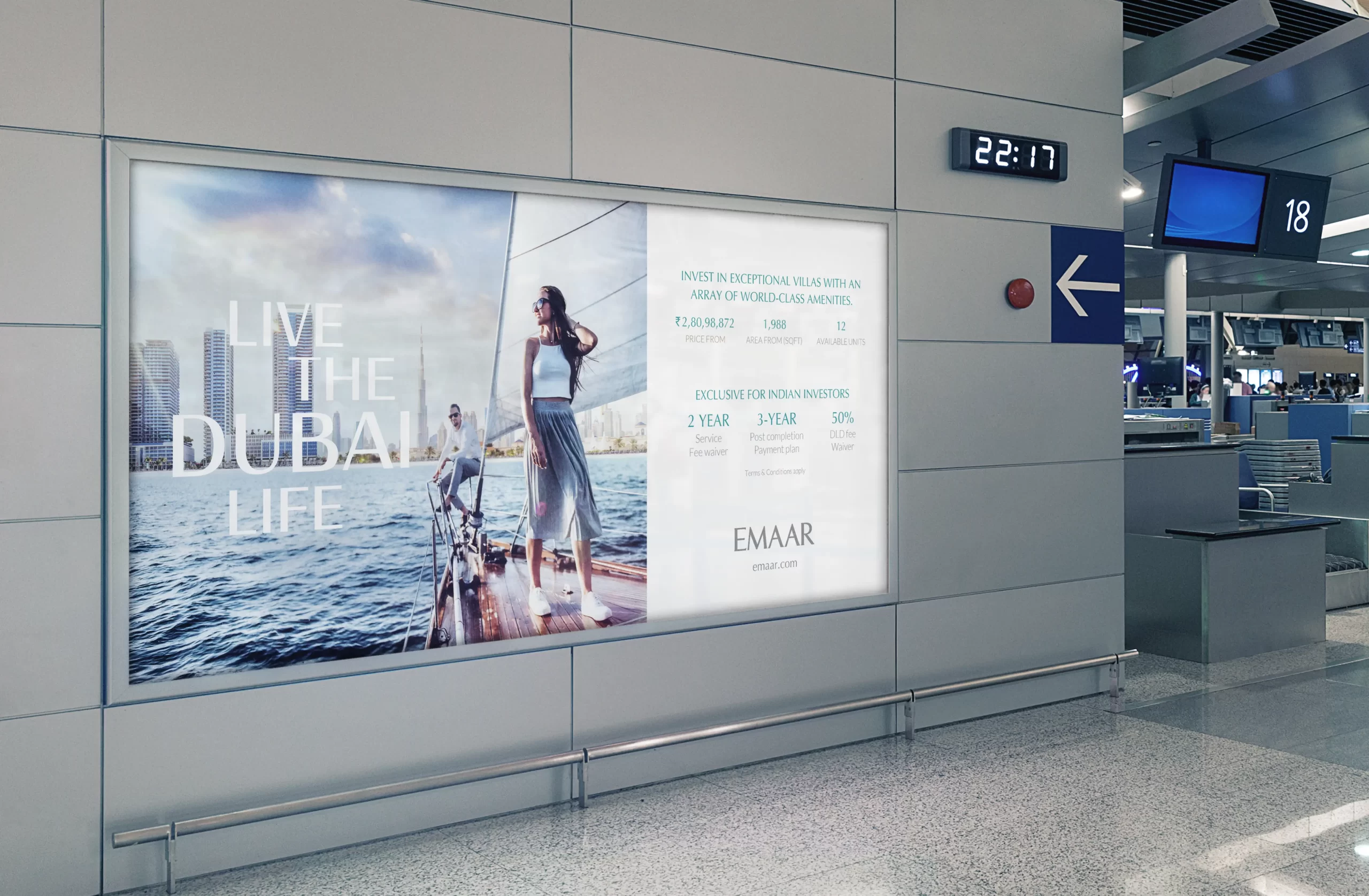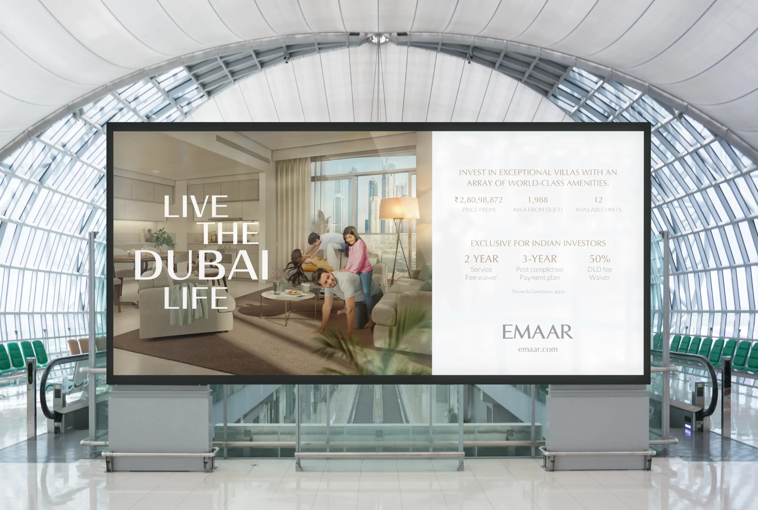 The ‘Live the Dubai Life’ campaign combined aspirational storytelling with targeted messaging to connect with investors. The headline captured Dubai’s luxury lifestyle, while visuals showcased Emaar’s developments and thriving communities. Initially crafted for the Indian market, the campaign emphasized exclusive offers and lifestyle appeal, creating a compelling narrative. Its adaptable structure enabled expansion into global markets, with consistent visuals and messaging deployed across print, outdoor, digital, and airport branding, making it one of Emaar’s most impactful campaigns.