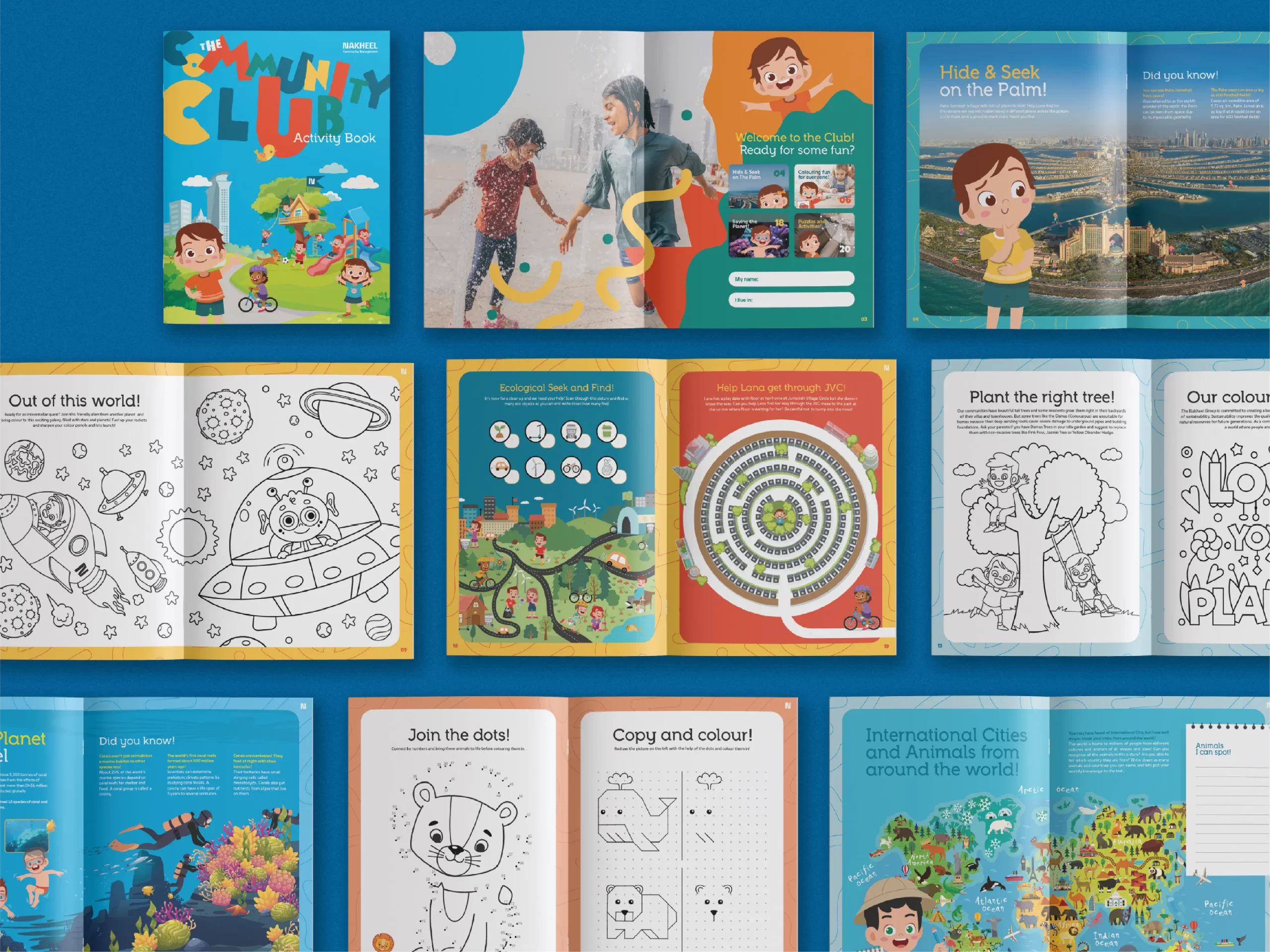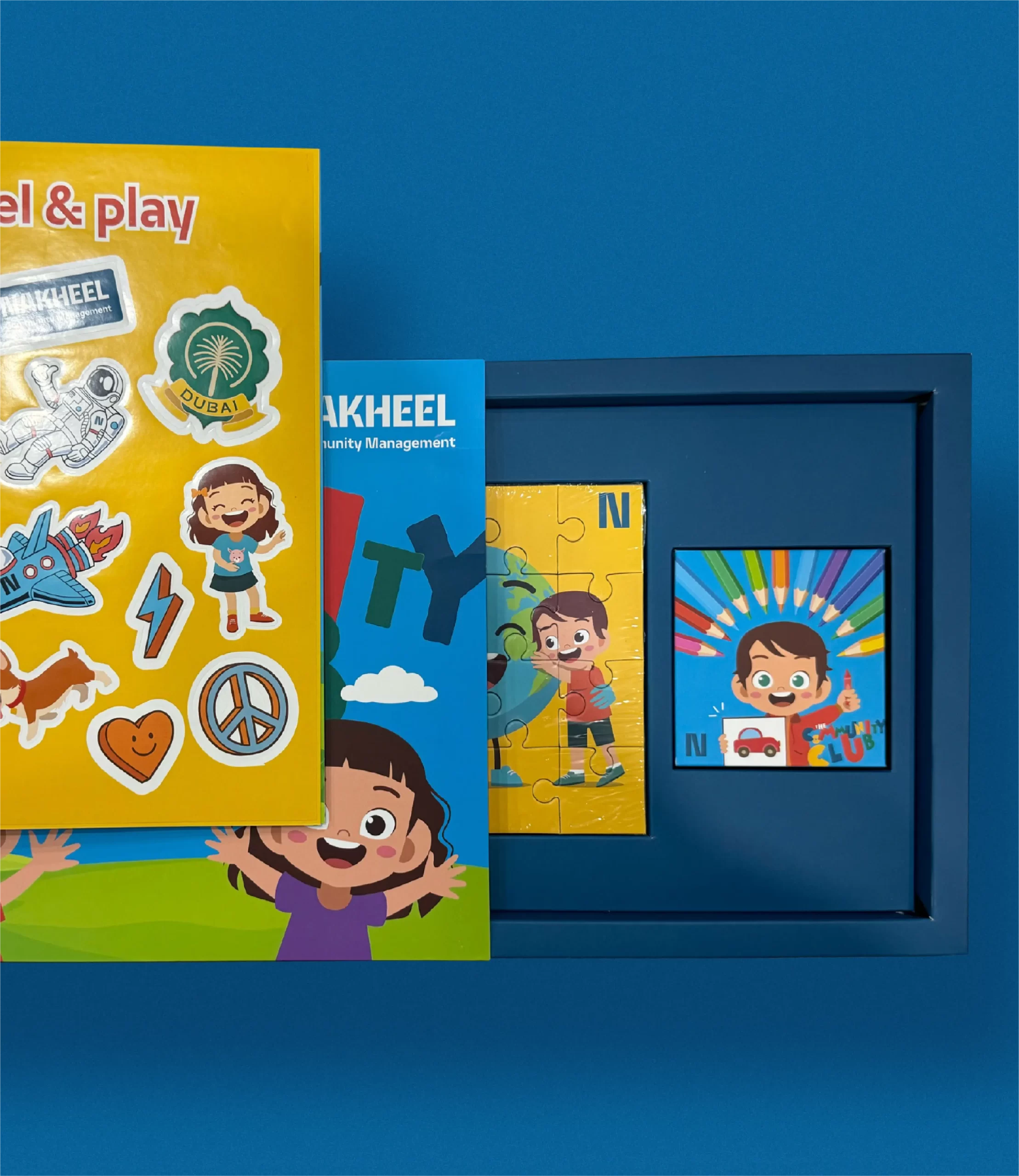 Our creative team developed playful illustrations that depicted diverse children enjoying life in Nakheel’s family-friendly communities. The content also highlighted Nakheel’s conservation initiatives, blending fun activities with meaningful learning. The production team ensured high-quality outputs, from books and sticker sheets to jigsaw puzzles and packaged colour pencils.